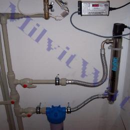 Rodinný dům s vlastní vodou ze studny. Rozborem vody bylo zjištěno vysoké množství bakterií. Pro averzi na chlorovanou vodu byla zákazníkem na desinfekci vody zvolena nerezová UV lampa 1,4m3, která UV zářením zahubí veškeré bakterie. Výkon UV lampy je závislý hlavně na velikosti nárazové spotřeby v objektu. Dále na celkovou ochranu byl nainstalován atlas filtr se sítovou 50mcr. vložkou. Výstupní hodnota vody je nyní bez bakterií a při tom bez chloru. Instalace dezinfekce je na bypasovém zapojení ve sklepních prostorách rodinného domu.