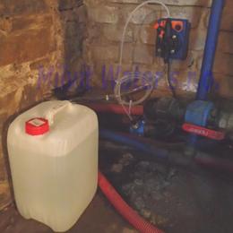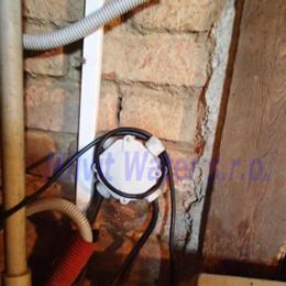 Odstranění bakterií dávkovacím čerpadlem ET 02/06 časové. Ve sklepě se nachází tlaková nádoba, potrubí v plastu.