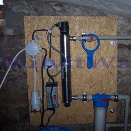 Jedná se o úpravu vody v rodinném domě se studniční vodou. Voda obsahuje nadlimitní množství bakterií. Do sklepa byla nainstalována UV lampa s Atlas filtrem 10" s 5mcr.vložkou. V místě instalace je elektrika, potrubí v plastu, tlaková nádoba a odpad.