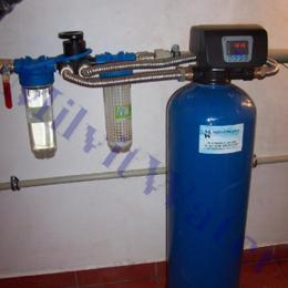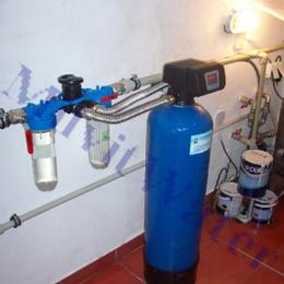 Jedná se o rodinný dům - novostavbu s čističkou odpadních vod. Rozbor vody ukázal kolísavou hodnotu železa 0,173 - 0,58 mg/l (MH 0,2 mg/l), vyšší hodnotu manganu 0,06 mg/l (MH 0,05 mg/l) a nadlimitní bakterie, které majitel bude řešit jiným způsobem. Do technické místnosti pod schody byl nainstalován odželezňující a odmanganující filtr A 35 P 300 G1". Zákazníkovi jsme vychlorovali systém a na vstup nainstalovali Atlas filtr 10" G1" se sítovou vložkou a na výstup Atlas filtr 10" s 5 mcr.vložkou. V místě instalace se nachází odpad - gule, elektrika a tlaková nádoba 60 lit.. Tlakové čerpadlo se nachází ve studni a spínač na tlakové nádobě.