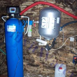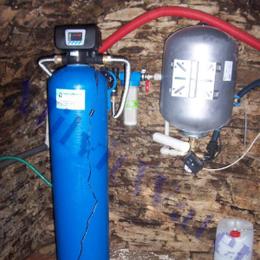 Jedná se o rodinný dům (chatu) s vodou ze studny. Rozbor vody ukázal na vysoké množství železa 1,8 mg/l (MH 0,2 mg/l) a manganu 0,72 mg/l (MH 0,05 mg/l) a s tím spojené vysoké hodnoty zákalu a barvy. Do klenutého sklípku pod schody byl nainstalován odželezňovací a odmanganovací filtr A 60 D G1" s dávkovacím čerpadlem ET-časové 02/06. Museli jsme vyvést hadici cca 10 m nahoru podél prahu u dveří, kolem futer do kuchyně do odpadní trubky HT 50 a vložit odbočku. Potrubí v plastu G3/4", tlakové čerpadlo se nachází ve studni, u tlakové nádoby je přístupný spínač tlakového čerpadla. Tlaková nádoba má asi 40 litrů. Na vstup jsme nainstalovatli Atlas filtr 10"G1" se sítovou vložkou a na výstup Atlas filtr 10"G1" s 5 mcr. vložkou.
