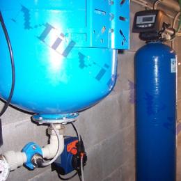 Úprava vody pro rodinný dům s vlastní vrtanou studnou. Voda obsahuje nadlimitní hodnoty železa 0,58-0,83 mg/l (MH 0,2 mg/l) a manganu 0,063-0,078 mg/l (MH 0,05 mg/l). Do sklepa k bazénové technologii byl nainstalován odželezňovací a odmanganovací filtr A 60 D s dávkovacím čerpadlem ET časové 02/06. V místě instalace se nachází tlaková nádoba cca 80 litrů, eleltrika, odpad HT 32-odbočka a veškeré potrubí je v plastu G1". Díky dávkovacímu čerpadlu je upravená voda bakteriologicky nezávadná. Na vstup byl nainstalován Atlas filtr 10" G1" se sítovou vložkou na odstranění mechanických nečistot a na výstup Atlas filtr 10" G1" s 5mcr. vložkou na odstranění kalu.