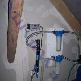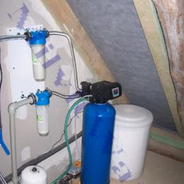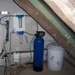 Jedná se o rodinný dům s kopanou studnou. Rozbor vody ukázal vyšší hodnotu železa 0,87 mg/l (MH 0,2 mg/l) a manganu 0,18 mg/l (MH 0,05 mg/l), dále nadlimitní bakterie a CHSK Mn 3,6 mg/l (MH 3 mg/l). Do technické místnosti, která se nachází v půdních prostorách, za 5 litrovou nádobu byl nainstalován změkčovací a zároveň odželezňovací a odmanganovací filtr A 35 K G1". Na vstup i filtru byl nainstalován Atlas filtr 10" G1" se sítovou vložkou a na výstup Atlas filtr 10" G1" s 5 mcr. vložkou. Dále byla nainstalována UV lampa G 3/4" 2,3 m pro bakteriologickou nezávadnost vody. V místě instalace nachází potrubí v plastu DN 20 a elektrická zásuvka. Odpad PVC 110 byl vzdálen 2 metry.