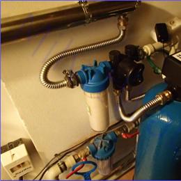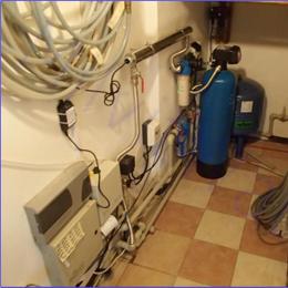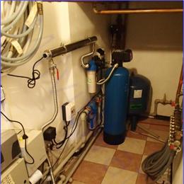 Jedná se o úpravu studniční vody. Rozbor vody sice neprokázal nějaké nadlimitní prvky mimo bakterií, ale železo a mangan jsou na hranici mezních hodnot. Železo vyšlo 0,18 mg/l (MH 0,2 mg/l) a mangan vyšel 0,04 mg/l (MH 0,05 mg/l). Jelikož nám zákazník sdělil, že tyto hodnoty kolísají, pro jistotu si od nás nechal nainstalovat filtr A35P300 G1", který mu sníží případně zmíněné prvky železa a manganu. Bakterie se jako nadlimitní objevily a to Koliformní >100 KTJ/ml (MH 0 KTJ/ml), kolonie při 22°C >570 KTJ/ml (MH 500 KTJ/ml) a kolonie při 36°C 376 KTJ/ml (MH 100 KTJ/ml). Na bakteriologickou nezávadnost jsme umístili jako poslední článek celé filtrační sestavy UV lampu SC 12 G3/4", před kterou se ještě přidal filtr ATLAS 10" G3/4" s 5mcr. vložkou na mechanické částice. Odpad nebyl připravený v den montáže, takže zákazník si ho dopojí sám.
