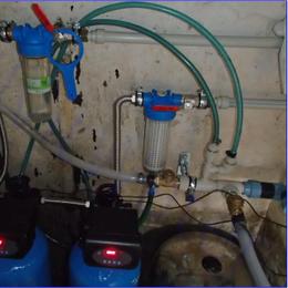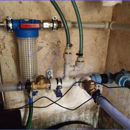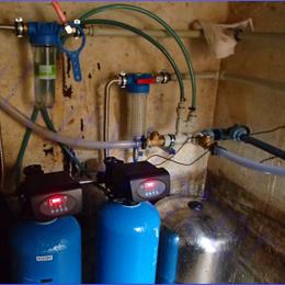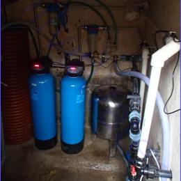 Filtrační sestava dvou filtrů na vodu z vrtané studny. Z výsledků rozboru vody má zákazník ve vodě drobně nadlimitní železo 0,285 mg/l (MH 0,2 mg/l), nadlimitní mangan 0,895 mg/l (MH 0,05 mg/l) a nízké pH 6,4 (6,5-9,5). Proto jsme na tyto hodnoty nainstalovali do podzemní šachty filtr odželezňovací-odmanganovací A35P300 G1" a filtr A35pH na jeho zvýšení. Pro bezproblémový provoz obou filtrů jsme nainstalovali mechanické filtry ATLAS 10" G1" se sítovou 50mcr. vložkou a s dočišťovací 5mcr. vložkou.