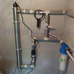 Jedná se o úpravu vody pro potřeby chalupy, chaty. Rozbor vody ukázal nadlimitní železo 7,05 mg/l (MH 0,2 mg/l), mangan 0,618 mg/l (MH 0,05 mg/l), amonné ionty 0,54 mg/l (MH 0,5 mg/l) a bakterie. Do technické místnosti byl nainstalován filtr A80EXtreme a UV lampa LUXE 12. pro bezproblémový chod filtru byl na vstup nainstalován Atlas filtr 10" se sítovou vložkou a na výstup Atlas filtr 10" s 5mcr.vložkou. V místě instalace potrubí v plastu, elektrika a odpad.