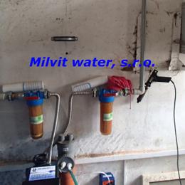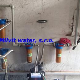 Jedná se o úpravu vody pro kravím a byt. Rozborem vody bylo zjištěno nadlimitní množství železa 1,97 mg/l (MH 0,2 mg/l), vysoké množství manganu 0,73 mg/l (MH 0,05 mg/l), zákalu 36,3 ZF (5 ZF) a bakterií. Do technické místnosti byl nainstalován automatický filtr A 100 P na odstranění mechanických nečistot pro kravín a A 35 EXtreme na odstranění nadlimitního železa, manganu, zákalu a na odstranění bakterií dávkovací čerpadlo ET 02/06 časové pro byt. Pro bezproblémový chod filtrů byly na vstup u každé chemické filtrace nainstalovány Atlas filtry 10" se sítovou vložkou a na výstupy Atlas filtry 10" s 5 mcr.vložkou. V místě instalace se nachází tlaková nádoba cca 600 lit., tlakový spínač, elektrika, odpad a potrubí v plastu před tl.nádobou G5/4" a za tl.nádobou G1".