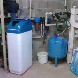 Rodinný dům s vlastní vodou ze studny. Rozborem vody byla zjištěna vysoká tvrdost vody 4,64 mmol/l (26 oN) - DH 2-3,5 mmol/l, vyšší hodnoty železa 0,34 mg/l (MH 0,2 mg/l) a vyšší vodivost vody, která je způsobena ze 3/4 tvrdostí vody. Do technické místnosti ve sklepě byl nainstalován změkčovací filtr A 30 K v kabinetovém provedení, které je vzhlednější a úspornější na prostor. Odpad z filtru byl veden pod stropem na protilehlou zeď do odpadního potrubí HT 110. Změkčovací filtr se regeneruje regenerační solí, kterou majitel cca 2x ročně dosypává do bílého kabinetového zásobníku. Dále byl instalován dočišťovací Atlas filtr P3 velikosti 10" včetně 80mcr.vložky. Majitel si vždy podle potřeby může změnit tvrdost vody. Zavlažování zahrady bylo odděleno od systému změkčení.