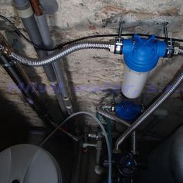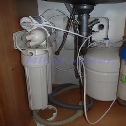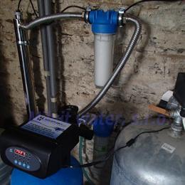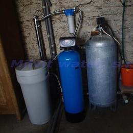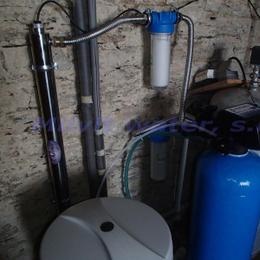 Jedná se o rodinný dům - 2 bytové jednotky. Kopaná studna obsahuje kolísavou vysokou tvrdost vody 3,75 mmol/l (21°N) až (31°N) - DH 2-3,5 mmol/l, kolísavé množství dusičnanů 57 - 115 mg/l (MH 50 mg/l) a nadlimitní množství bakterií. Do technické místnosti byl nainstalován změkčovací filtr A35K standard a UV lampa SC 12. V místě instalace se nachází potrubí v plastu, 100 lit.tlaková nádoba a tlakový spínač, elektrika a odpad v HT potrubí. Pro bezproblémový chod filtru byl na vstup nainstalován Atlas filtr se sítovou vložkou a pro čistou UV lampu Atlas filtr 10" s 5mcr.vložkou. Do kuchyňské likny byla nainstalována reverzní osmóza a Anex filtr, pro dofiltrování kolísavých dusičnanů. Dále byla nainstalována 3-cestná baterie.