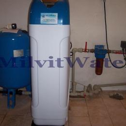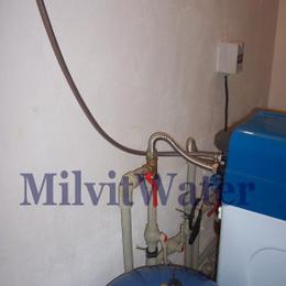 Poptávka se týkala změkčení obecní i studniční vody v rodinném domě. Majitel chtěl vody přepínat podle potřeby. Z rozboru vody bylo zjištěno, že obecní voda je středně tvrdá 2,86 mmol/l (16 °N) a voda ze studny extrémně tvrdá 12,14 mmol/l (68 °N) - DH 2-3,5 mmol/l. Přívod vody, 80 litrová tlaková nádoba a místo na filtr se nacházely ve sklepní technické místnosti, kam jsme nainstalovali změkčovací filtr A 35 K v kabinetovém provedení. K odpadu v oranžové 125, který byl 4 metry vzdálen jsme natáhli potrubí. Veškeré potrubí bylo v plastu. Dále byl na ochranu provozu filtru nainstalován Atlas filtr velikosti 10" se sítovou vložkou. Majitel byl poučen jak si přenastavit filtr při přepnutí z obecní vody na studniční a naopak.