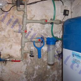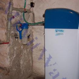 Poptávka se týkala patrového domu s obecní vodou. Vodovodní řád obsahoval velmi tvrdou vodu 5 mmol/l (28°N) DH 2-3,5 mmol/l. Místo instalace filtru se nacházela ve sklepě RD společně s přívodem vody, elektrikou a s odpadem HT potrubí. Veškeré potrubí bylo v plastu G1". Za vodoměr byl přez bypasové zapojení nainstalován změkčovací filtr A 35 K WG 5600 G1" v kabinetovém provedení. Majitel si může podle potřeby nastavit tvrdost výstupní vody. Na ochranu filtru byl nainstalován na vstup Atlas filtr 10" G1" se sítovou vložkou. Výstupní hodnota upravené vody byla nastavena na 6°N.