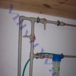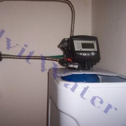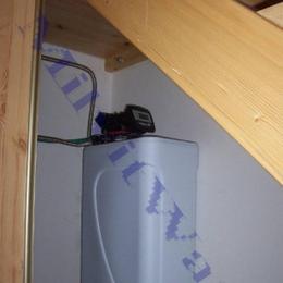 Větší rodinný dům s umístěným přívodem vody pod schody. Rozbor vody ukazuje na dosti tvrdou vodu 2,9 mmol/l (16 °N) - DH 2-3,5 mmol/l. Díky omezenému prostoru pod schody byl nainstalován změkčovací filtr A 35 K v kabinetovém provedení. Při instalaci se muselo vrtat skrz zeď, kvůli napojení na přívod vody. Rozvody v rodinném domě jsou v plastu a odpad HT taktéž za zdí. Připojení tlakové vody a filtrace za tlakovou nádobu. Na žádost majitele byl vydesinfikován celý systém Savem - studna, bojler a potrubí teplé užitkové vody a celý rozvod PPR studené vody. Pro ochranu celkového systému filtru byl na vstup nainstalován Atlas filtr velikosti 10" G1" včetně sítové vložky na odstranění mechanických nečistot. Výstupní voda po úpravě má tvrdost 6°N. Podle potřeb se dá přenastavit tvrdost vody.